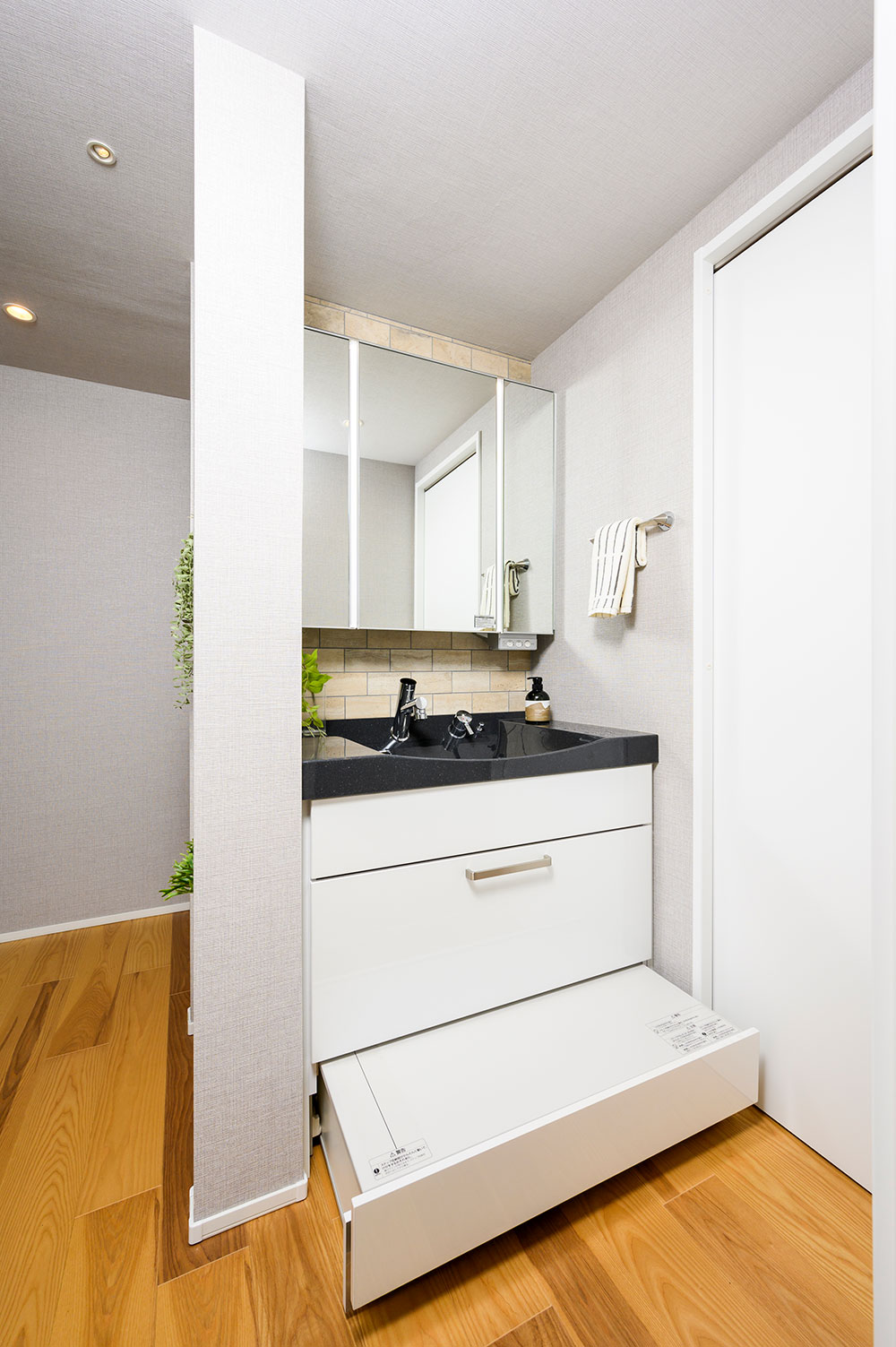 子どもとの使用時を意識した「ステップ付き」の洗面化粧台。