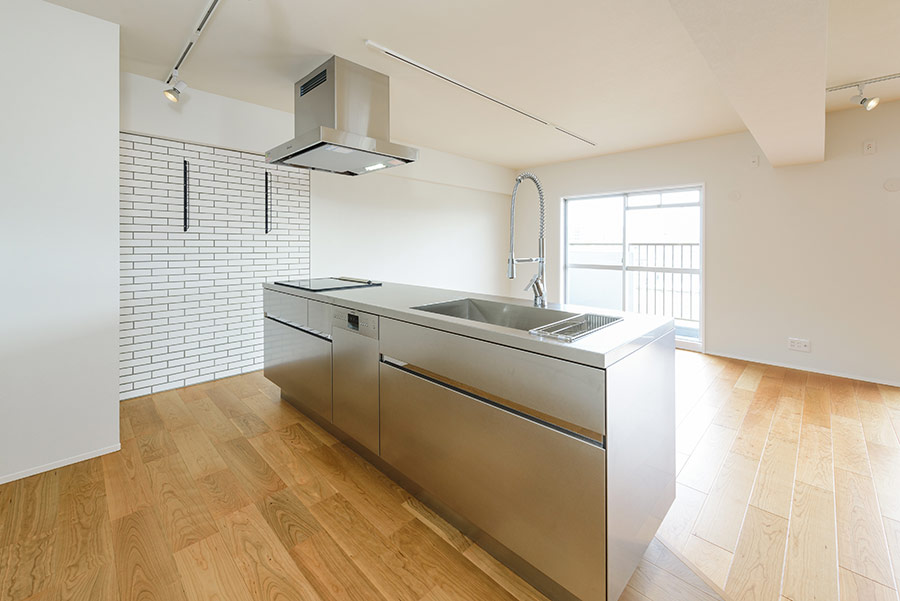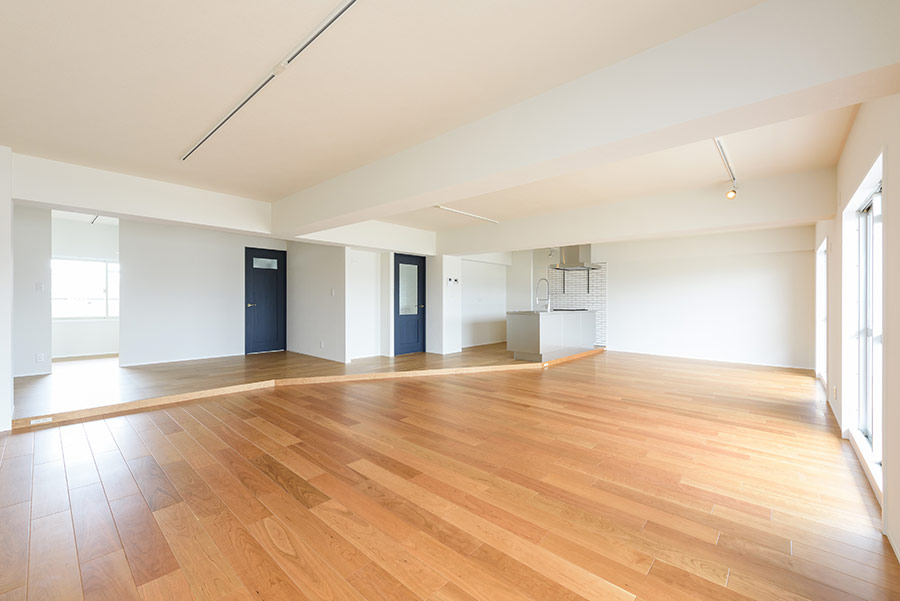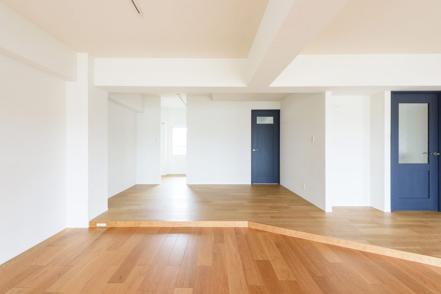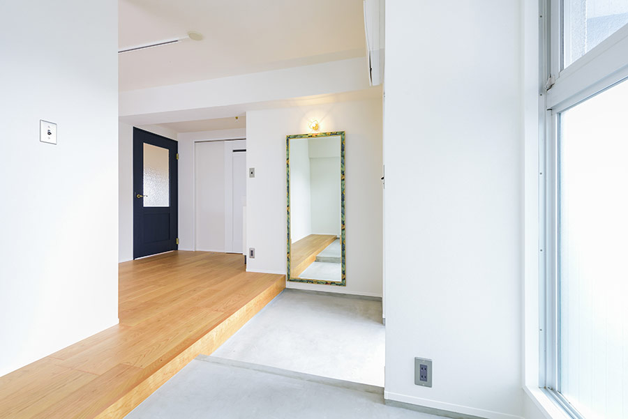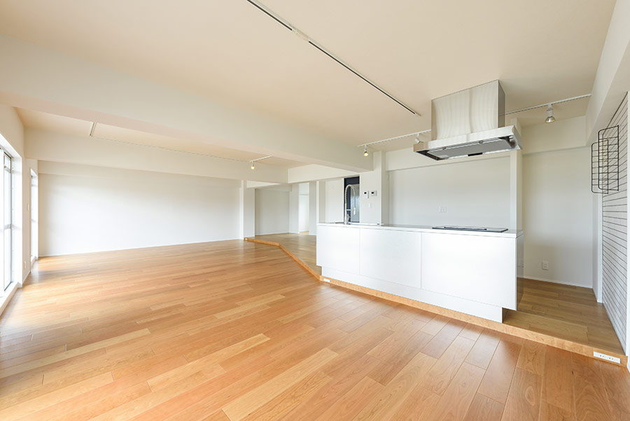 99平米の1ルーム。これだけで想像力をかき立てられる空間ですが、キッチン部分とリビング部分の床レベルに差をつけたことで、広いだけでなくメリハリのある空間となりました。