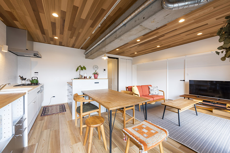 天井の羽目板、剥き出しの梁、スパイラルダクトなどリノベーションの人気アイテムも採用し、スタイリッシュでカッコいい空間となりました。