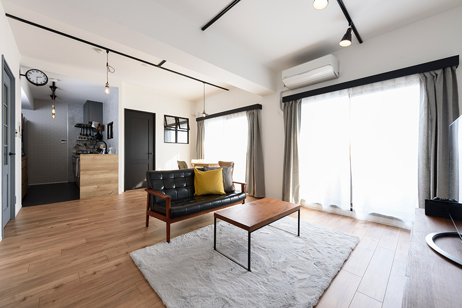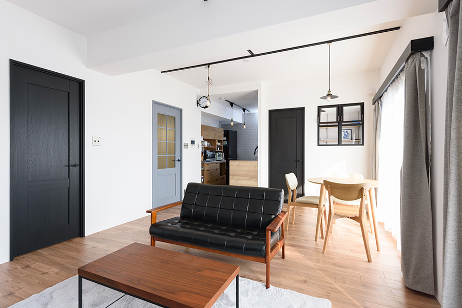 室内ドアとダクトレール、それに室内窓サッシの黒がアクセントになった「カッコいいけど、懐かしい雰囲気のするお家」の完成です。
