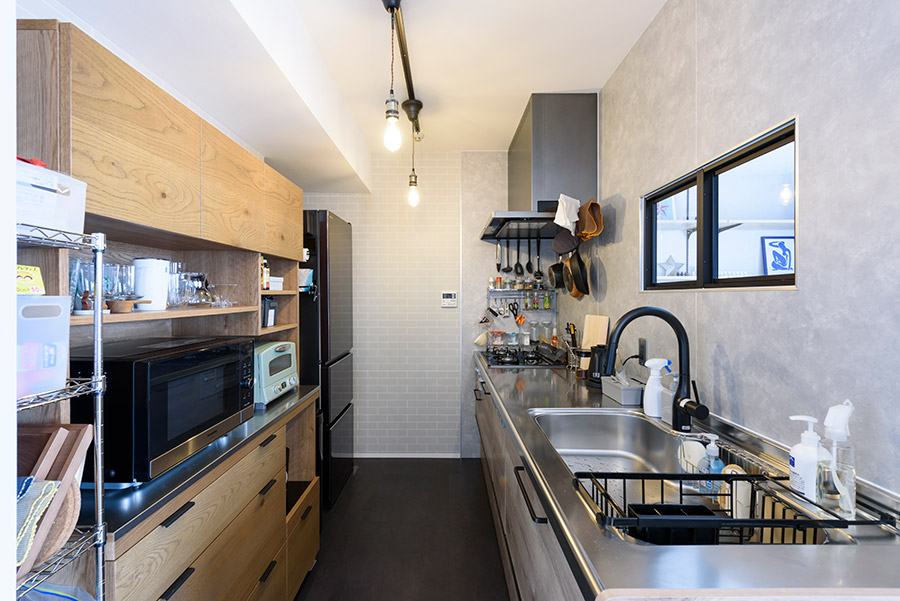 その影響でキッチンはセミクローズ仕様になったものの、光と風が抜ける室内窓をつけたことで、落ち着いた店舗のような空間に仕上がりました。