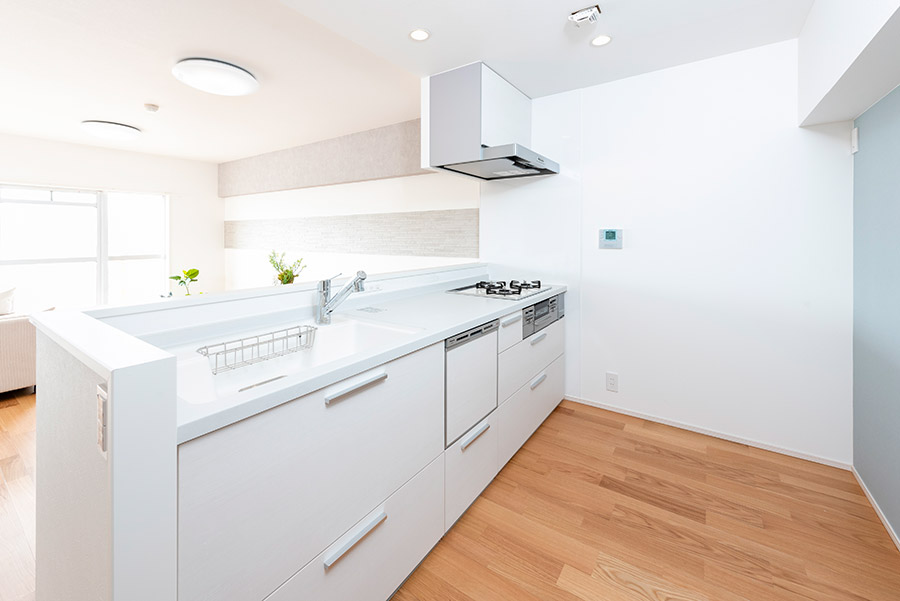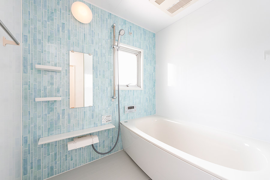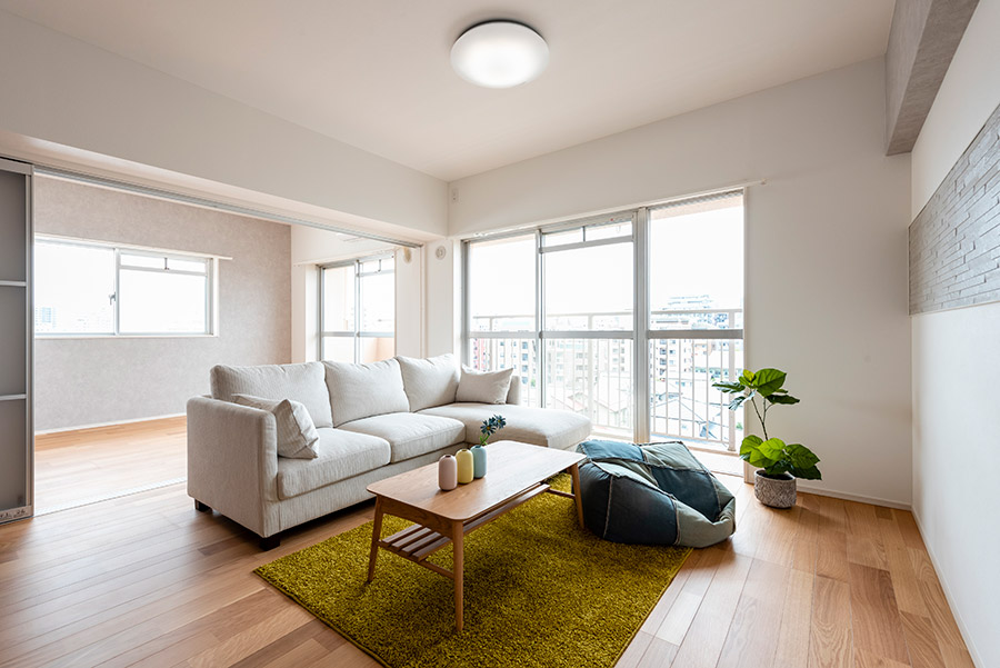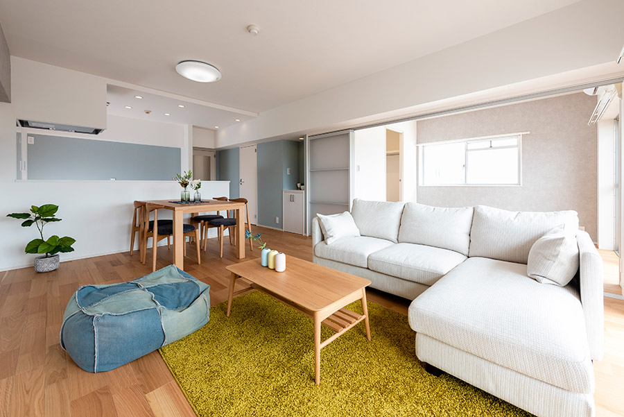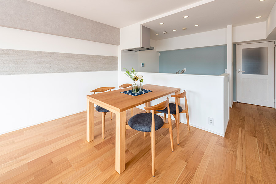 西新駅にも別府駅にも徒歩で行ける好立地のマンションを、シンプルでかわいい空間へとリノベーションしました。淡いブルーをアクセントカラーとし、リビングや玄関、お風呂などを中心に爽やかな印象に仕上がっています。