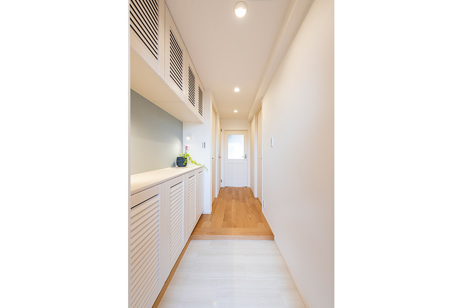 お家の顔となる玄関に設置した小さな照明、リビングのアクセントタイル、ヘリンボーンのクッションフロアなど、ちょっとしたセレクトで空間の印象が変わることを感じられる現場となりました。