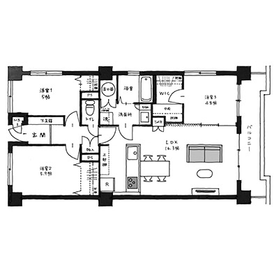 床材はランダム幅のフローリングを活用したことで、アシンメトリーながらもナチュラルな空間となっています。また、扉デザインや取手についても、少し存在感のあるデザインを選定したことで「かわいい」空間作りに役立っています。