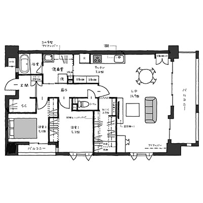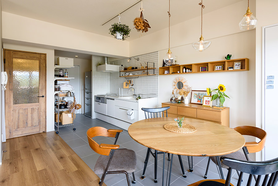 今回のお宅は、マンションの高層階ならではの「景観」が大きな魅力でした。そのため、旧和室部分も含めたリビングの暮らしやすさを最優先し、そこからストレスの少ない家事動線を配置しています。