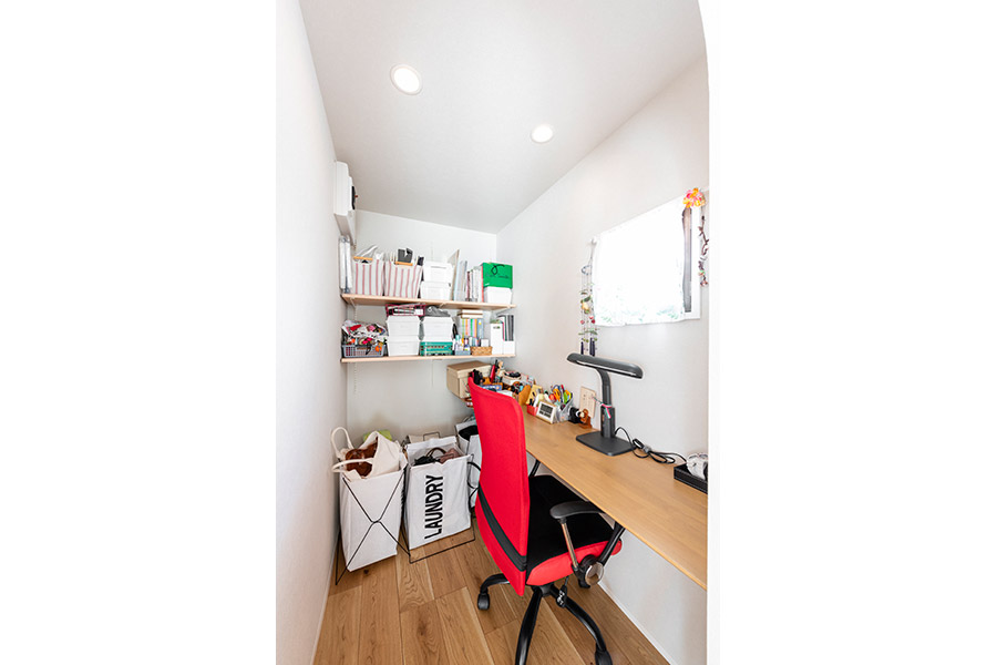 玄関土間や奥さま用の家事室、洗濯物も干すことが出来る広々とした脱衣所、帰宅してすぐに手が洗える廊下の洗面化粧台、ちょっとしたお昼寝も可能な小上がり空間など、ご夫婦それぞれの夢を余すとこなく叶えた理想のお家となりました。
