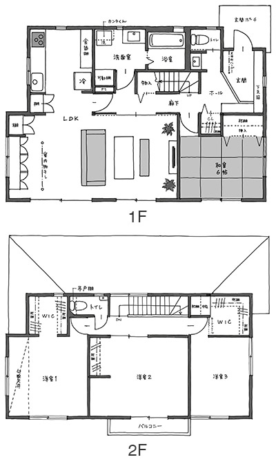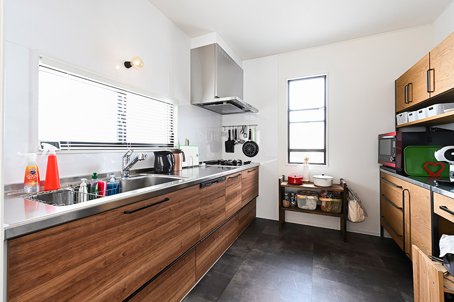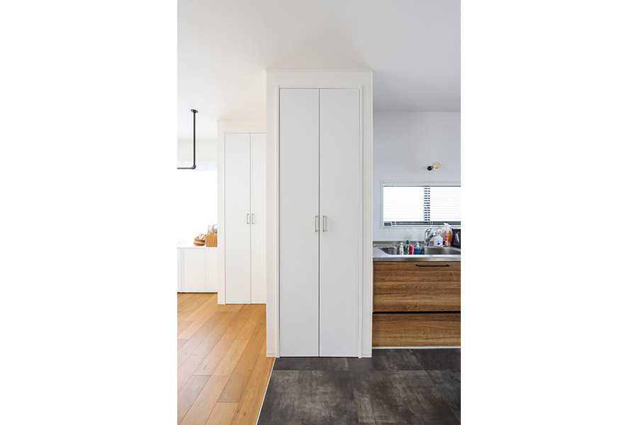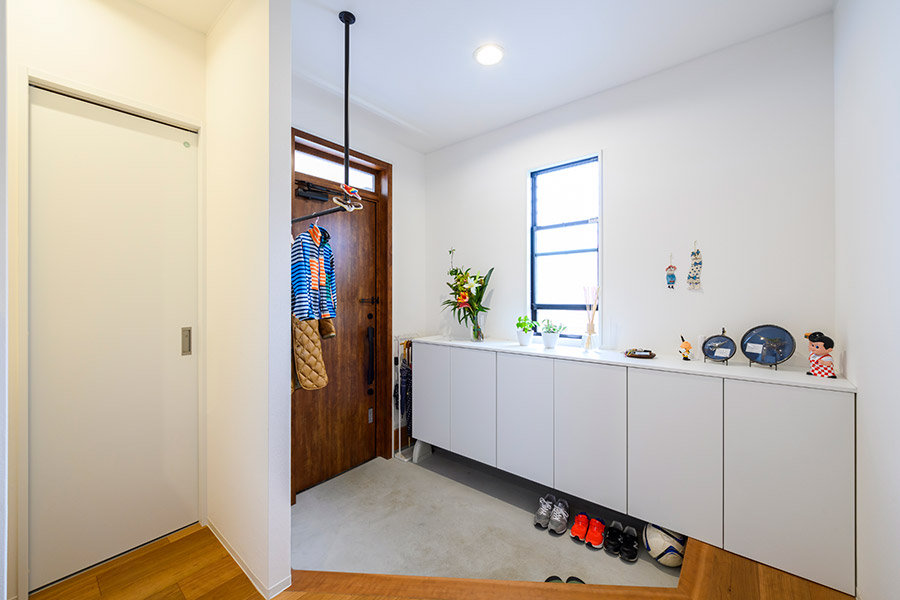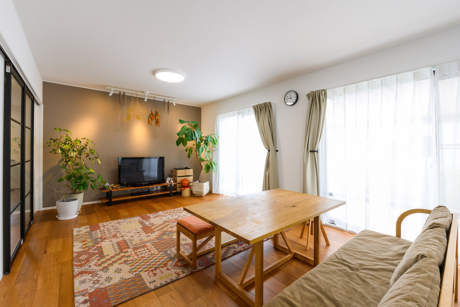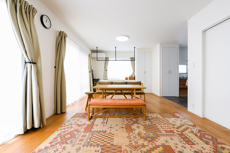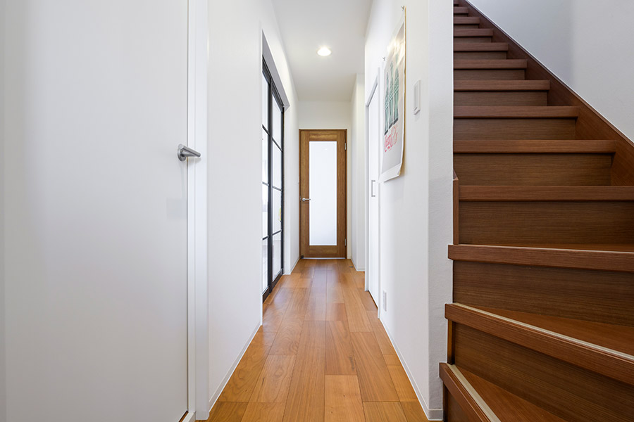 プランニングでこだわったのは、ご家族が長時間過ごす空間の心地よさ。玄関、リビング、廊下などのパブリックゾーンはナチュラルなテイストで統一し、光と風が抜ける開放感ある空間となっています。そこに、ご夫婦が選んだ統一感ある家具を置かれたことで、やさしくて、居心地の良い空間に仕上がりました。