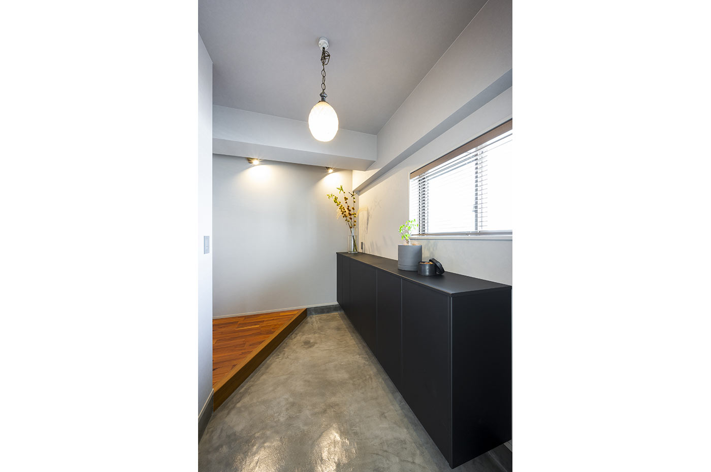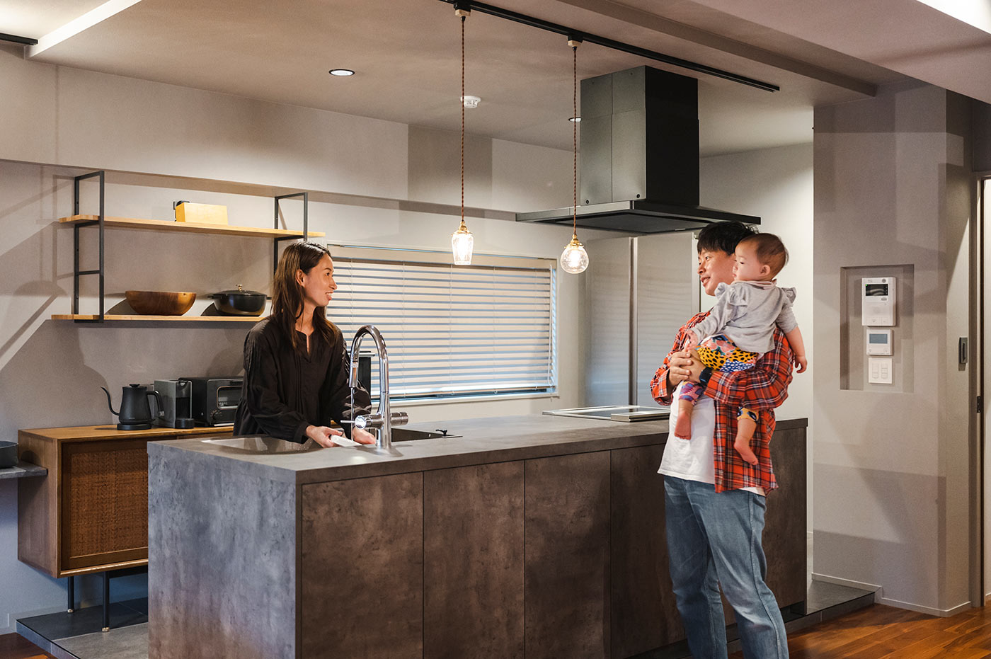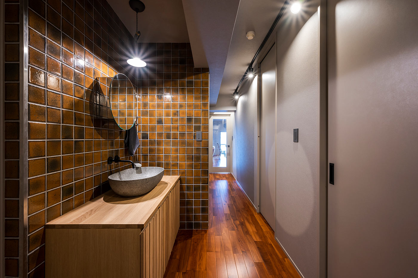 宅内は経年変化を楽しめる無垢材のフローリングをベースに、本宅のアイコンにもなっているタイル、グレーのクロス、玄関の艶ありモルタルなど存在感のある素材を活かしたコーディネートが特徴です。