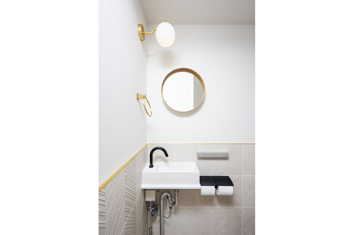 どんな家具ともマッチする床材をベースに、全体を包み込むようなテイストのクロスがセレクトされています。そこにグラフテクトやクアドロスリムなどのスタイリッシュな設備をさりげなく配置し、タイルや照明器具などが空間アクセントとなっています。