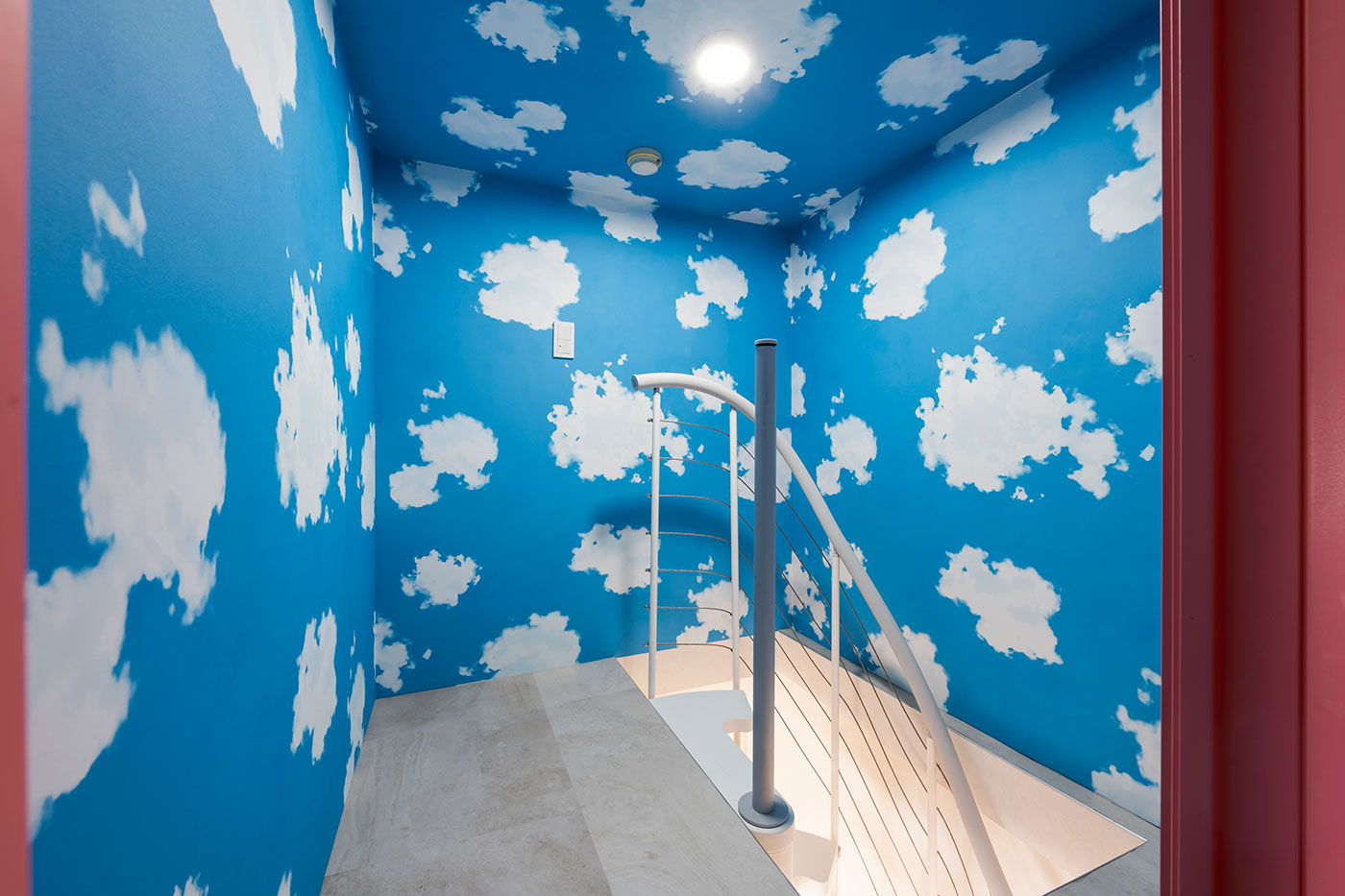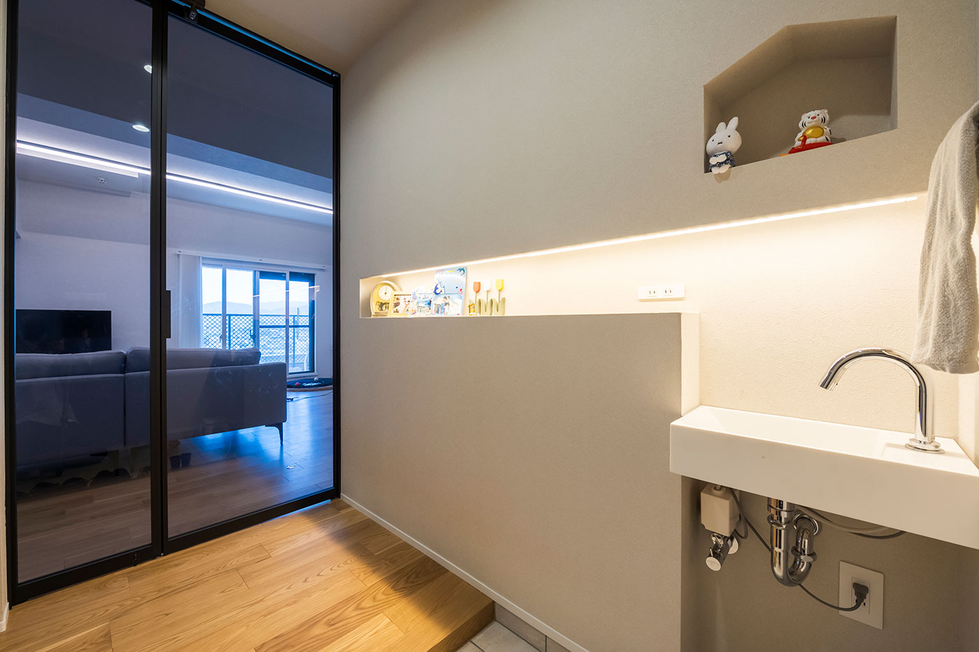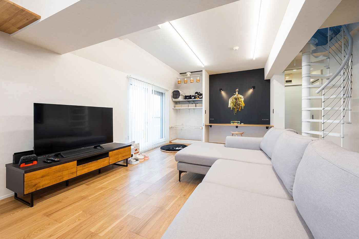 アフターコロナの時代に必須となった「手洗いスペース」は宅内に3箇所も設置し、混雑を回避しました。また、ロフトへのアクセスを担う「らせん階段」は、イタリア製の輸入品を使用。存在自体がリビングのアイコンとなっています。