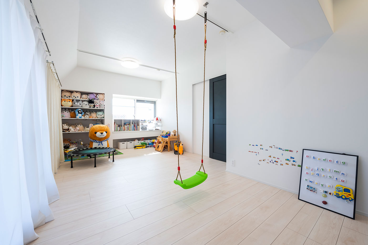 まずはリビングの広さを活かしつつ、ご夫婦それぞれのプライベート空間を確保。子ども部屋は、将来の2分割を前提としています。