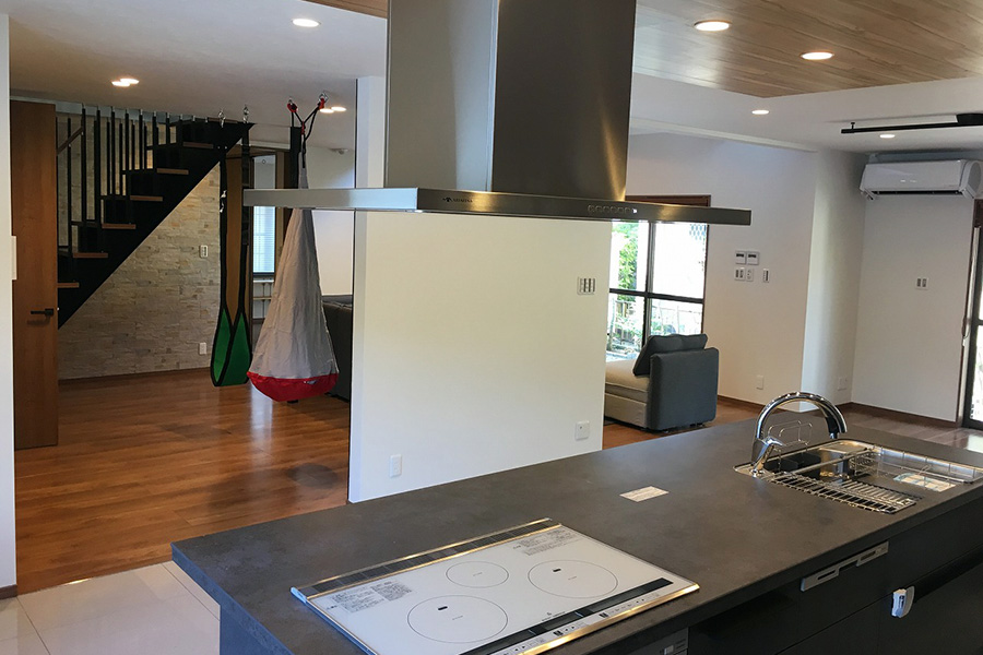 ボルダリングの壁や、何箇所にも設置した室内ブランコ。宅内の4箇所すべてでオリジナル仕様となった手洗台。そして、各所の仕様に合わせて設置したIKEAの収納システム。ハイクラスな設備から一般的な商材までを区別なく活用しながらも、全体としては統一感のあるお宅に仕上がっています。時間をじっくりとって頂けたことで、リノベーションの魅力が十分に詰まったお家が完成しました。