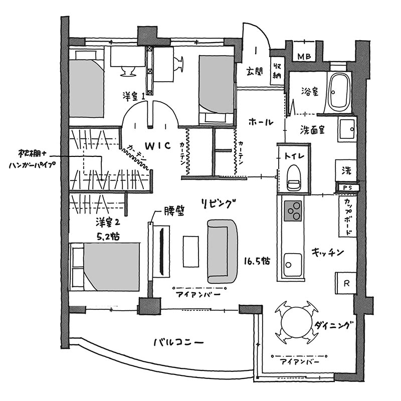 間取りをなんと表記すればいいのか、とっても難しいお宅です。リビングに隣接した「洋室2」は、写真を見ていただくと分かるように、壁の上部が開放されています。そのため、不動産会社によっては個室ではなく、リビングと見なすかも知れません。