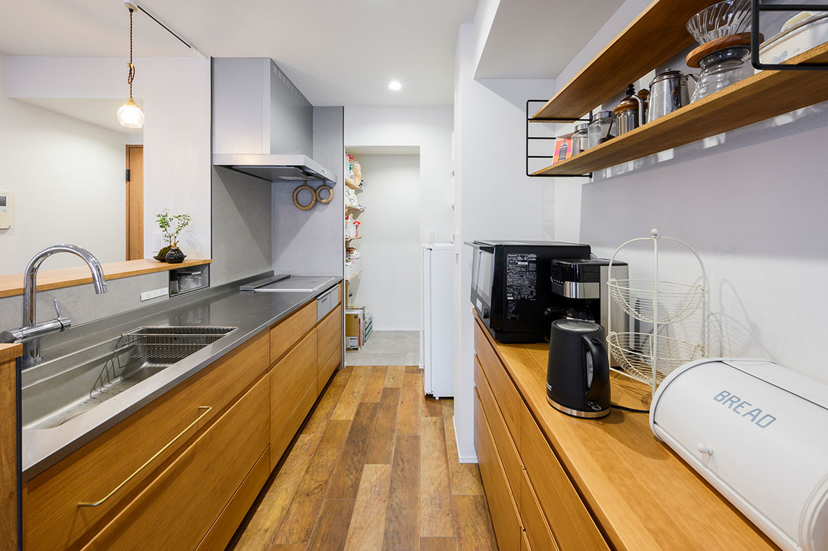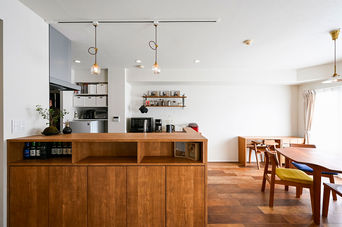 長く住んだ家だからこそ、課題も明確です。まずは、ご夫婦の住み心地アップを目指しました。一番の不満だったキッチンは、向きを変えることで導線を改善し、さらに収納力も大幅にアップ。特に、カウンター裏のスパイス置き場がお気に入りです。