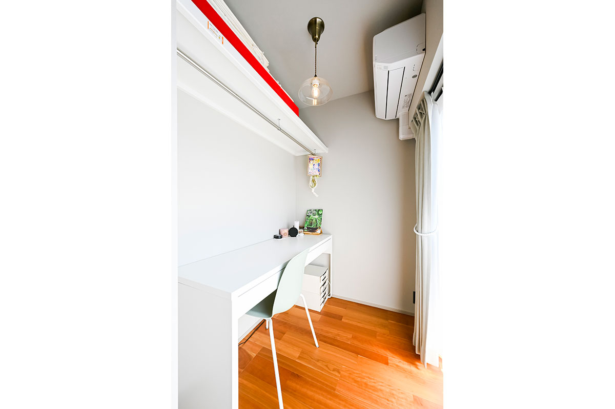 2つの個室を確保するには、60㎡というコンパクトなサイズが課題でしたが、そこは巧みなプランニングで解決。同時に、キッチンやカップボードを無垢製に統一することで、お好みの雰囲気を実現しました。