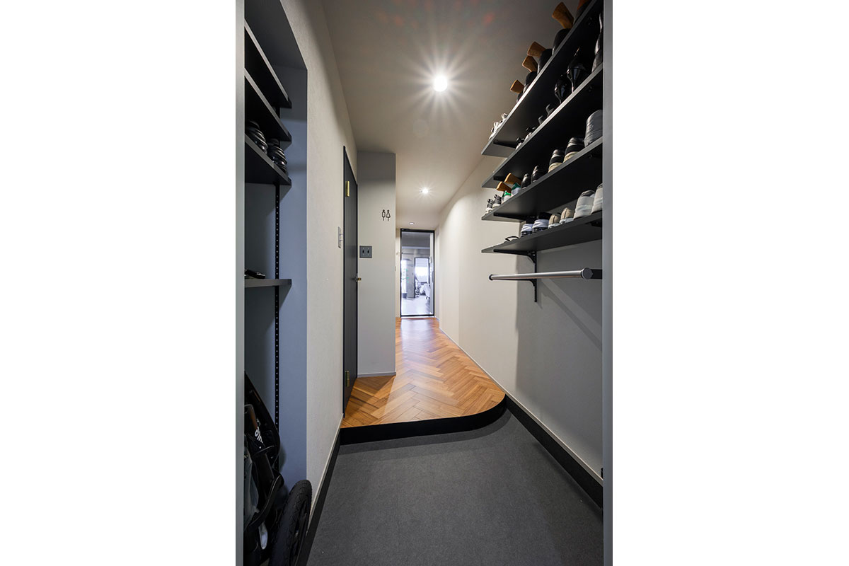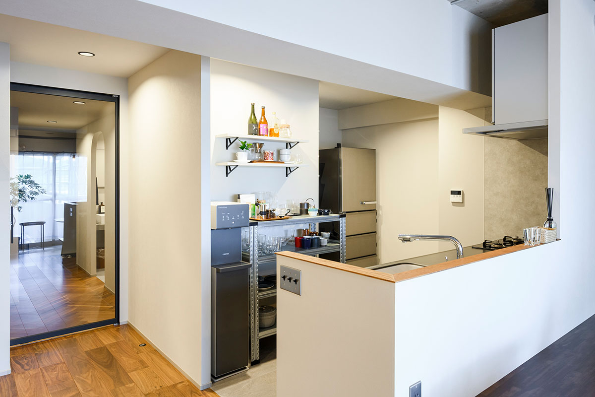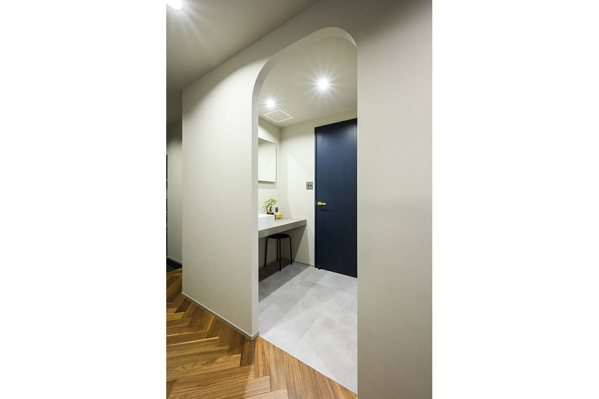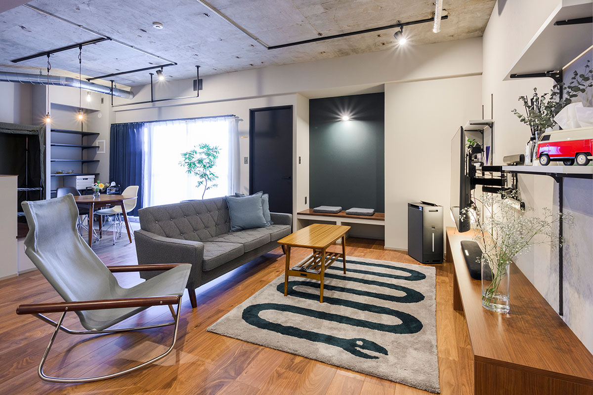 モルタルの天井、剥き出しの配管、トグルスイッチなど、リノベらしいオシャレなアイテムが随所に見られるお宅です。印象に残る廊下のヘリンボーン柄を、ユニットバスの壁面でも採用するなど、インテリア関係の仕事をされているご主人だけあって、ひとつずつのセレクトからセンスを感じられます。