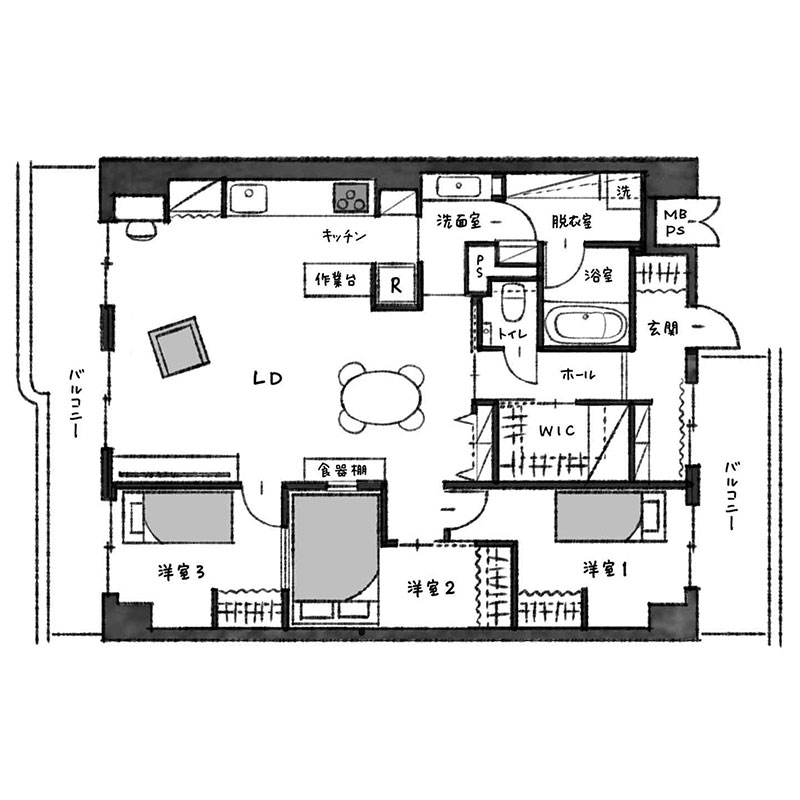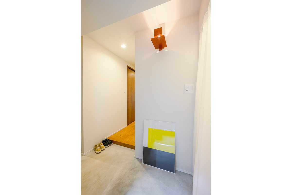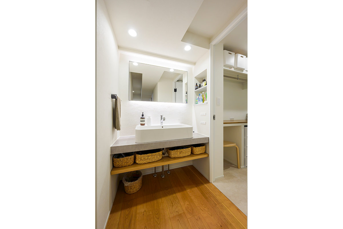 4人家族が快適に暮らせるよう、リビングに隣接した廊下部分に洗面スペースを設置。冷暖房が効いた空間で、快適に朝の準備ができそうです。脱衣室に広いカウンターを設置したことで、ランドリースペースとしても利用可能。ご夫婦のこだわりが、各所に詰め込まれたプランとなっています。