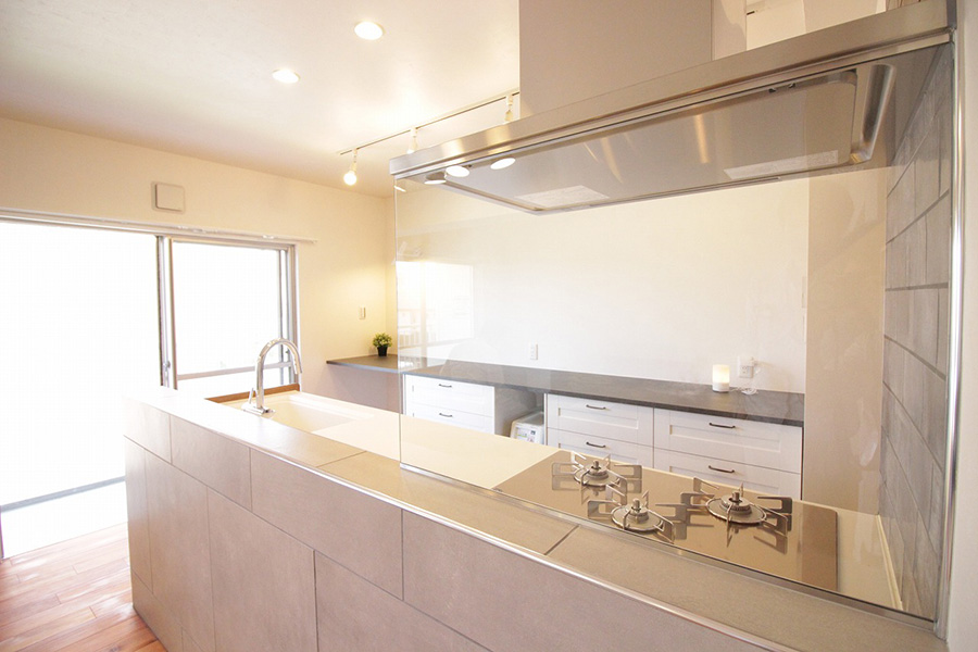 今回、床材にはサンワカンパニーのマホガニー系の無垢材を使用しています。しかも、乱尺(一つずつの長さが異なるフローリング材)を組み合わせたことで、とっても立体的な空間となりました。また、お家の中で一番のアイコンになっているキッチンは、背面の仕上げ(タイル)にこだわり、IKEA製のカップボードと組み合わせたことで個性あふれるキッチン空間となっています。