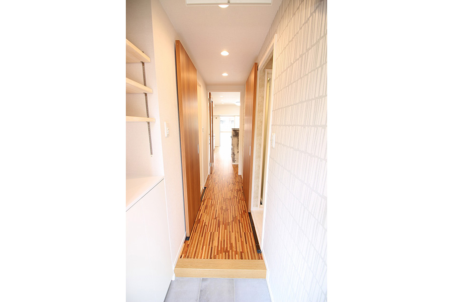 そんなお宅をお一人で暮らされるお客さまが購入され、余裕を感じさせるレイアウトにリノベーションされました。床にはサンワカンパニーの個性的なフロア材を採用する一方、建具やキッチンはシンプルなテイストで統一することで、全体の雰囲気はスッキリとさせました。