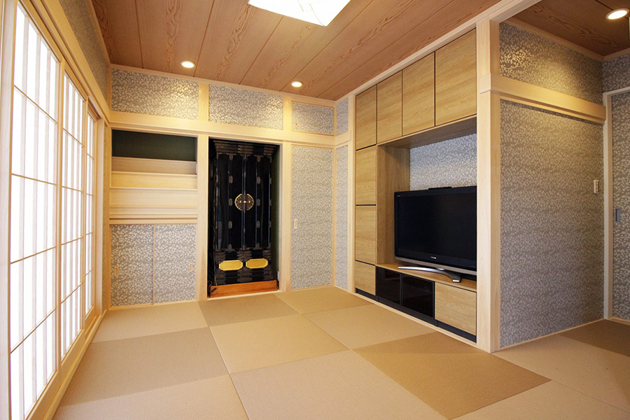 また、大家族ならではのゆとりをもった水回りスペースを確保する一方、本格仕様の和室も新たに造作して戸建の風格も維持させて頂きました。