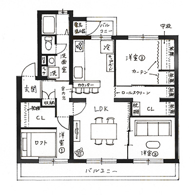 団地仕様のしっかりとした建物の1室を、現代的で暮らしやすい空間へとリノベーションさせて頂きました。子どもたちの成長に合わせて使い分け可能なリビング兼洋室、通路を兼ねた巨大な収納スペース、さらにはロフトまでも設置し、家族が増えても安心な収納空間を確保しました。
