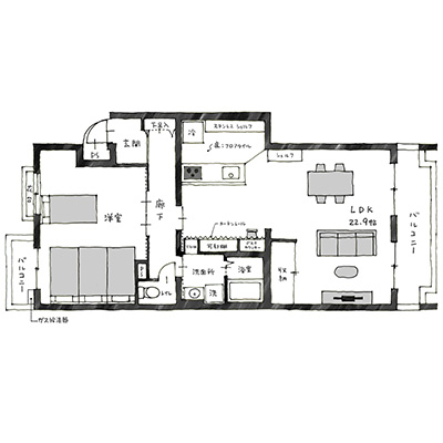 35年前は4LDKだったマンションを、これまでの入居者が少しずつ改装してきた結果、販売時点では1LDKの大空間へと生まれ変わっていました。