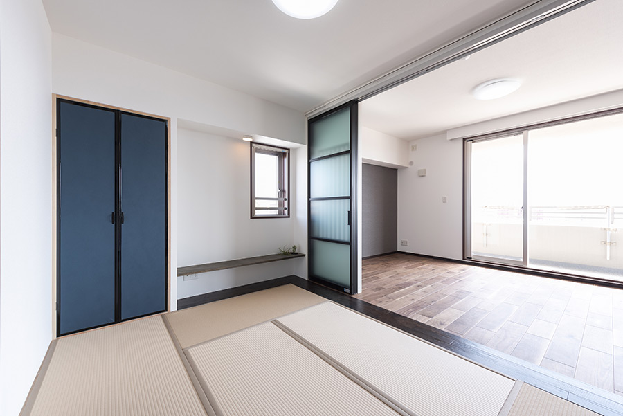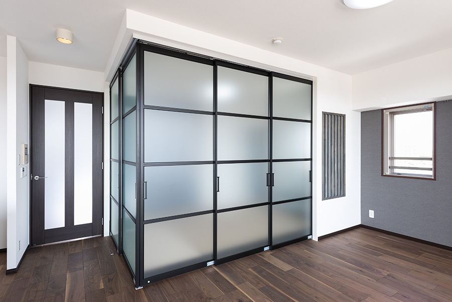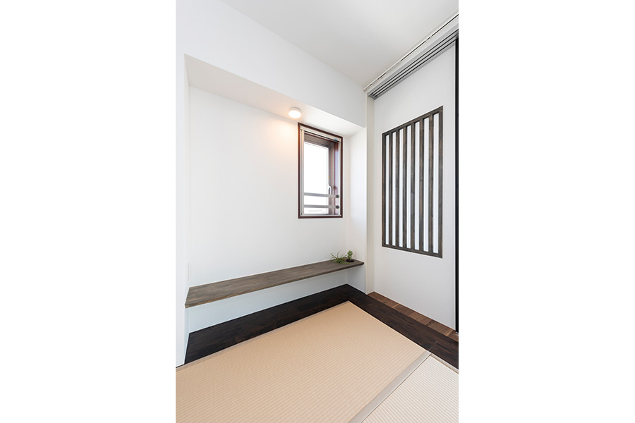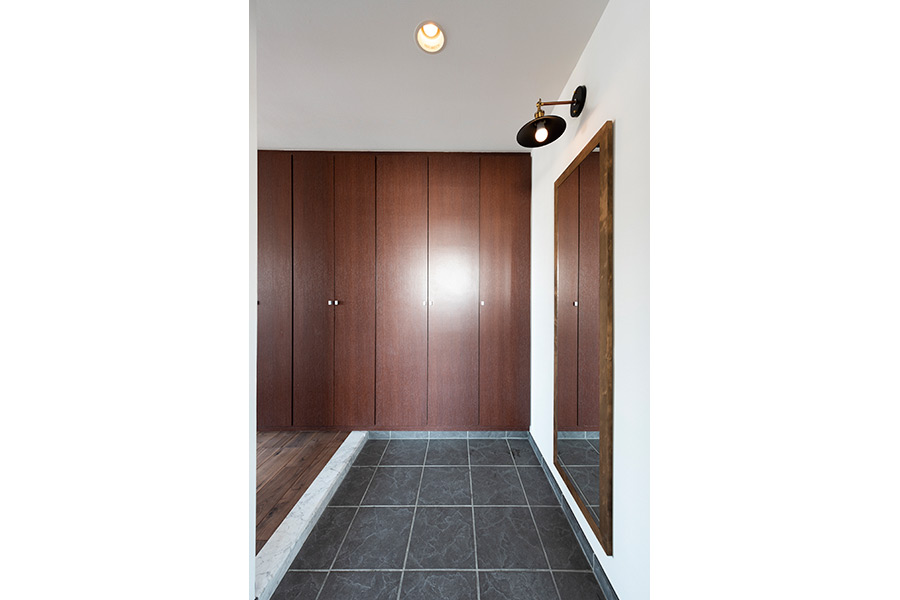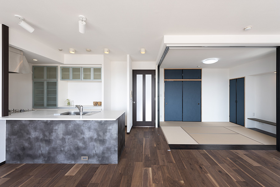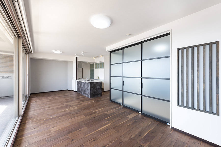 今回のお宅ではウォールナット素材の挽き板を贅沢に敷き詰めたことで、大きく間取りは更新していないものの雰囲気が一新。ハイクラスなマンションにふさわしい、落ち着いたリビング空間へと生まれ変わりました。