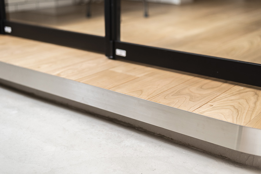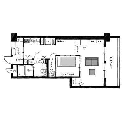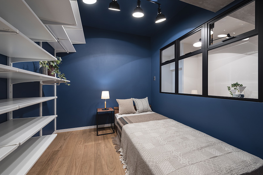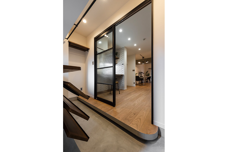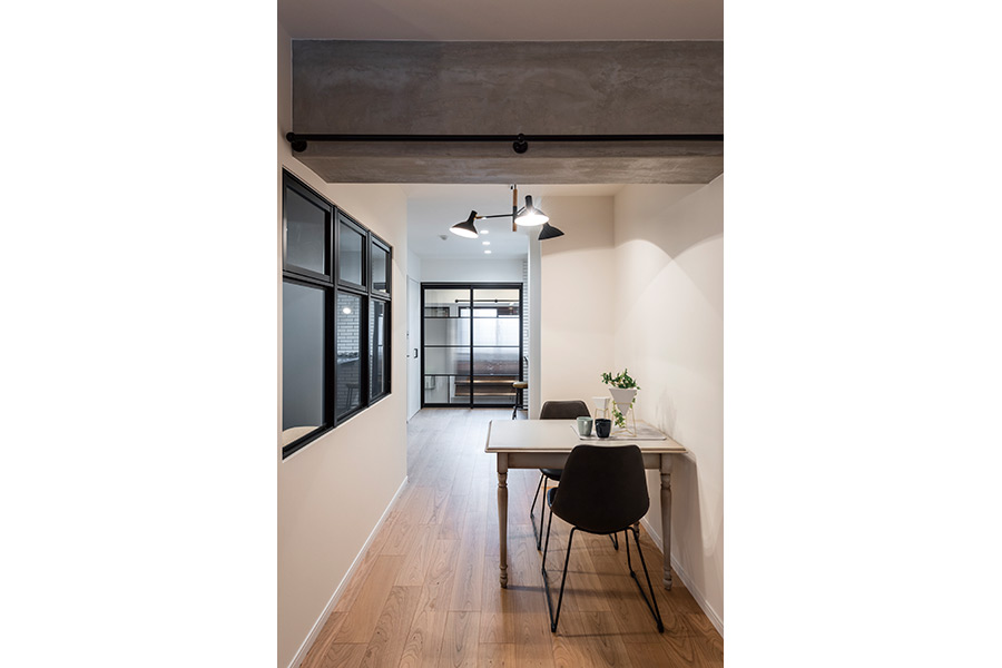 玄関に土間を新設し、ガラスの間仕切り戸を配置したことで「明るさ」を確保しています。その上で、寝室を部屋の中央に設置することで「生活空間」を最大化しました。