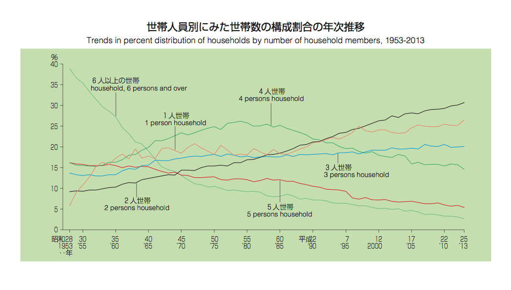 こちらを見て頂くと分かるように、現在もっともシェアが高いのは「2人世帯」で、続いて「1人暮らし」。その後が3人世帯で、4人世帯はシェア16%程度の4番手です。