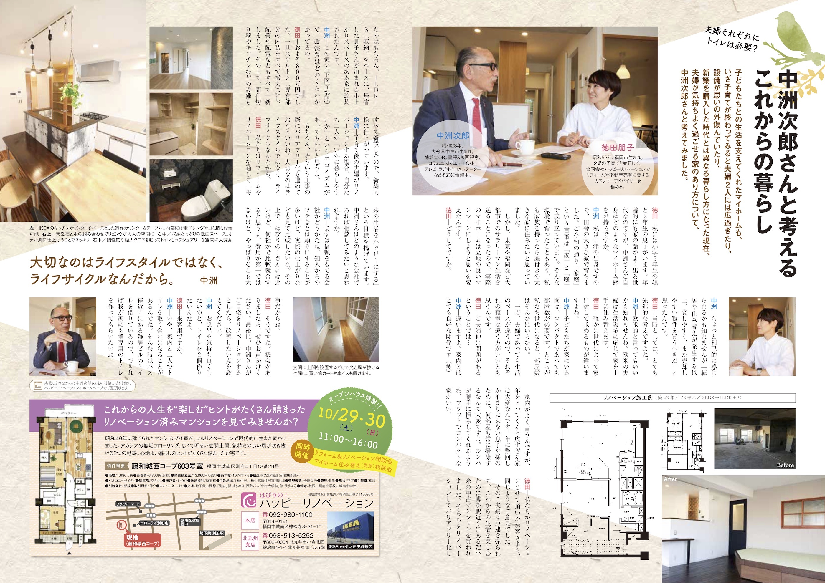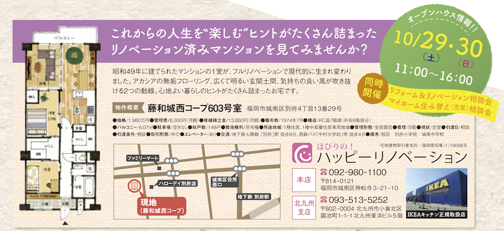 ぐらんざ世代の方を主な対象とした「リフォーム&リノベーション相談会」、「マイホーム住み替え相談会」を当社モデルルームで開催致します。ご興味のある方はハッピーリノベーション(092-980-1100)までお電話ください。
