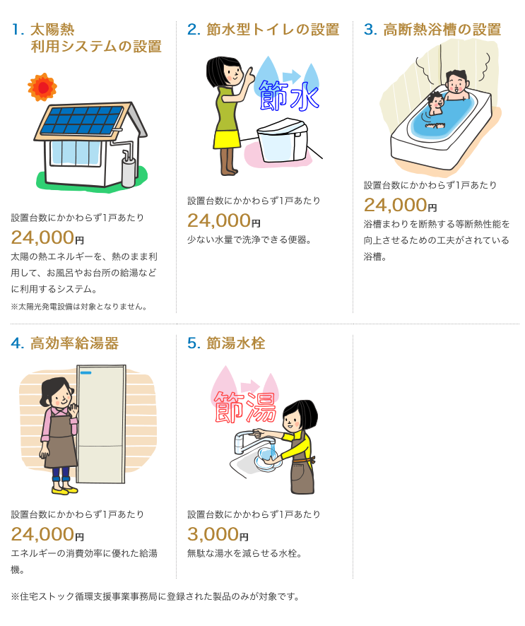 上記1~5の設備のうち3種類以上を設置すると「設備エコ改修」となり、単独でも申請可能になります。フルリノベをする方であれば節水型トイレ、高断熱浴槽、節湯水栓は対応可能機種も多いので、適応しやすいですね。