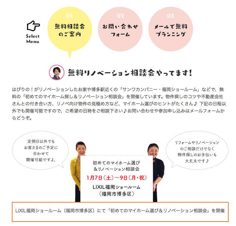 はぴりの!が初めてリクシル福岡ショールームで開催する「初めてのマイホーム選び&リノベーション相談会」は、新春にふさわしいお得がたくさん揃ったイベントになりました!お気軽にお電話下さい♪