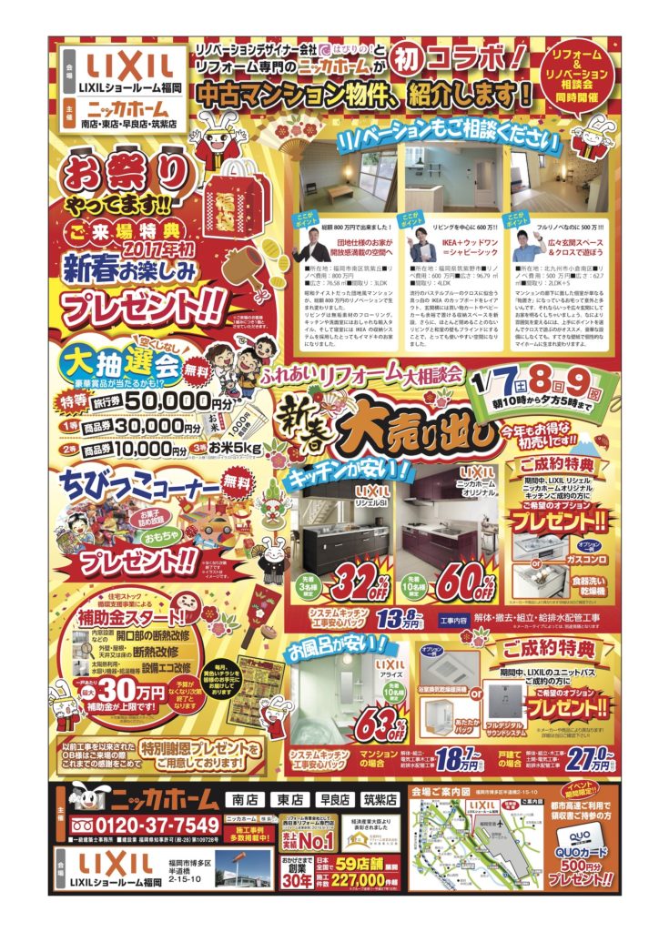 2017年の年明けを祝う「お得がいっぱい!」のイベントを、下記の通り開催させて頂くこととなりました!リフォーム&リノベーションをお考えの方も、2017年こそはマイホームを手に入れたいとお考えの方も、新年にふさわしいメリットたくさんのイベントです♪