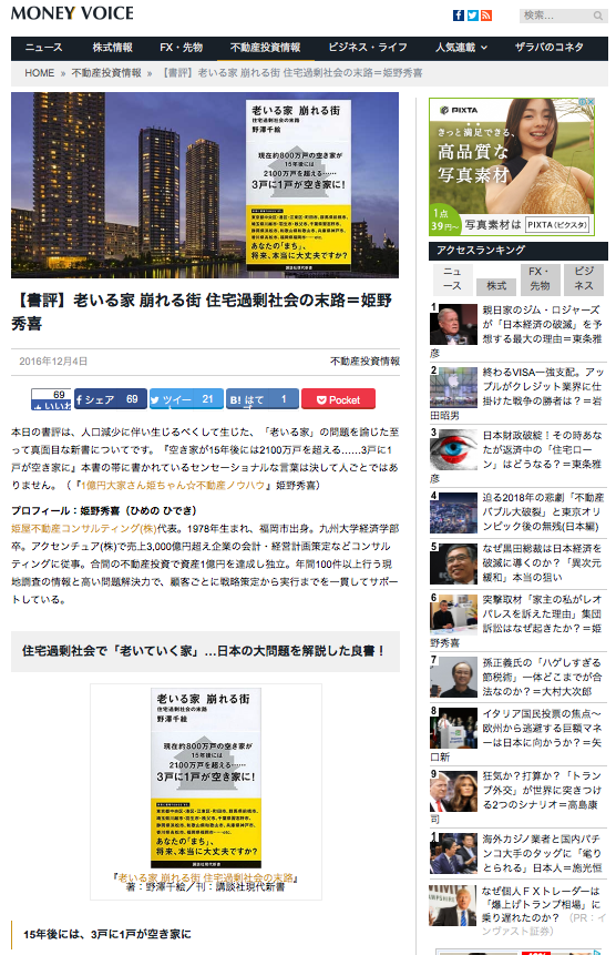 ※ こちらは不動産に関する人気ブロガー・姫野秀喜さんが書いた「老いる家 崩れる街 住宅過剰社会の末路」の書評です。