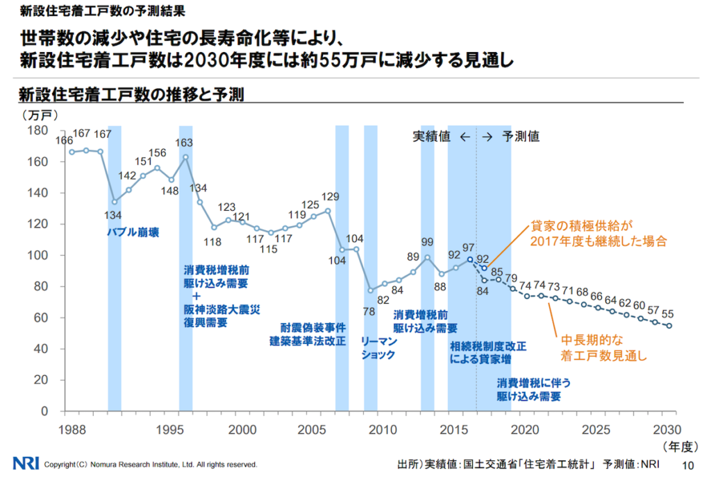 野村総研の調べでは2017年には97万戸だった新築戸建が、2030年(わずか23年後)には55万戸へと40%以上も減少することが予想されています。