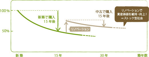 もうちょっとだけ堅い話の続きをさせて頂くと、「中古+リノベーション」は新築住宅に比べて取得時の価格が安いだけでなく、購入後の価格下落も穏やかなのが特徴です。