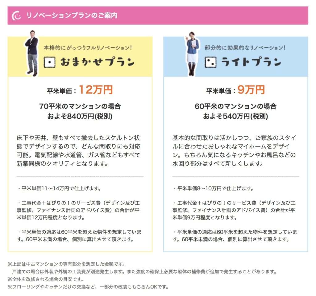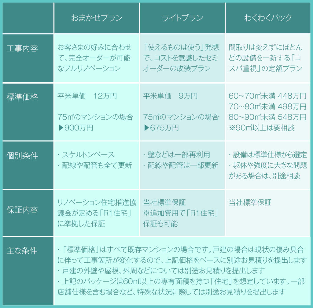 一方、いまお住まいの家を改装される場合は、傷んだ部分を把握されている方が多いと思われるので「ライトプラン」や「わくわくパック」をベースに、傷んだ部分の「補修」を少し加えても良いかも知れません。