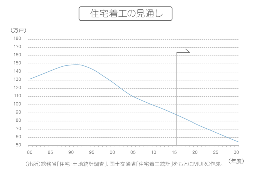 このような流れの中で、新築の住宅着工数は大きく減少することが見込まれています。2017年度に97万戸だった着工数は、2030年度にはなんと55万戸(43%減/市場規模としてほぼ半減)になることが予想されているんです。