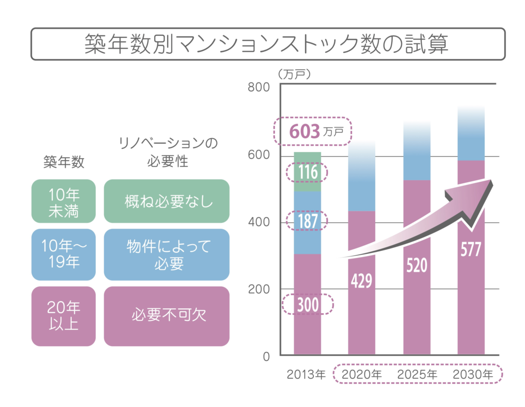 そんな中、2013年時点で全国にはマンションのストックは603万戸存在し、その内リノベーションの対象となる築20以上の物件が2020年だと429万戸、2030年には577万戸へと増加すると言われています。