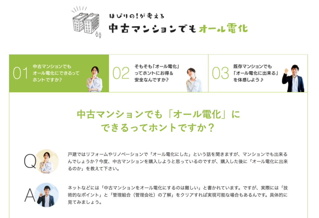 上記の特設ページに、もう少し詳しく「オール電化」について解説しています。お住まいになる方たちの家族構成や必要な電力容量など、条件次第で「最適な答え」は当然異なります。それでも、これまでのように「中古マンションのオール電化は出来ませんよ」ではなく、「条件はありますが、中古マンションでもオール電化に出来ますよ」とリフォーム業界が考えを進化させていくためにも、私たちなりの最初の一歩にしたいと考えています。
