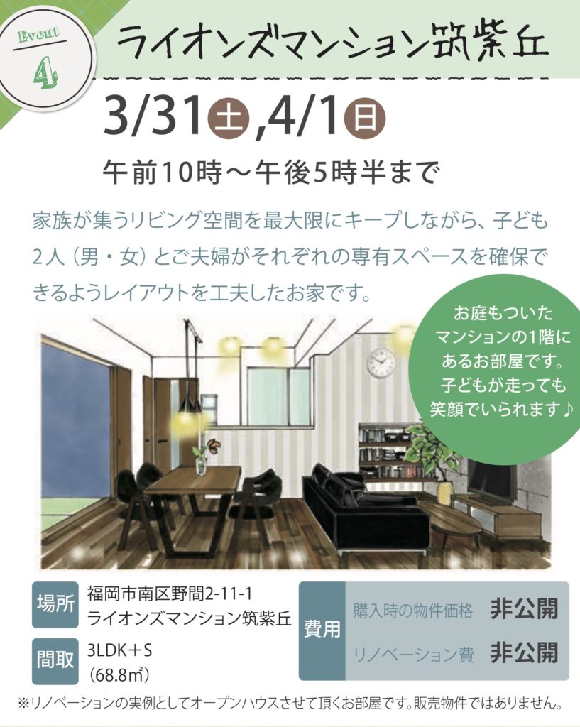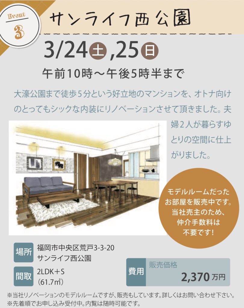 昨年2回オープンハウスをさせて頂き「これまでのはぴりの!のテイストと違って、オトナかっこいい(新築マンションのような!?)仕上がり」と好評頂いたサンライフ西公園。なにより立地が素晴らしく、ご自分が住まれても、資産運用としてもOKなこちらのお宅でオープンハウスを開催。こちらのオープンハウスには資金計画のプロも同席してくれるので、お家探しをされている方には最適のイベントとなっています。
