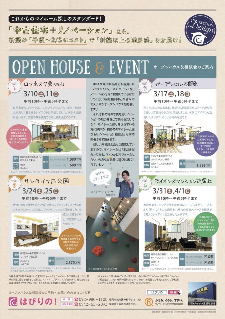 はぴりの!では3月に各地でオープンハウスなどを予定しています。マイホーム探し中の方も、リフォーム&リノベーションにご興味がある方もお気軽にご来場ください♪