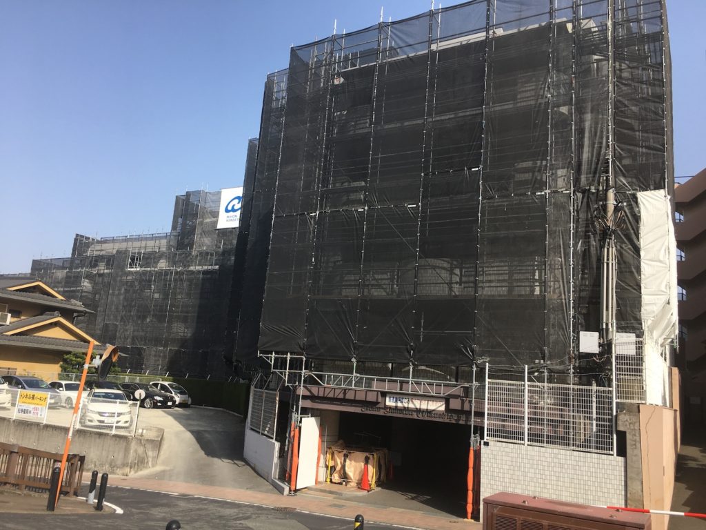 現在は大規模修繕に伴う外壁塗装中なので、こんな風に足場で覆われていますが、こちらの1階にあるお宅を大規模に改装させて頂きました。