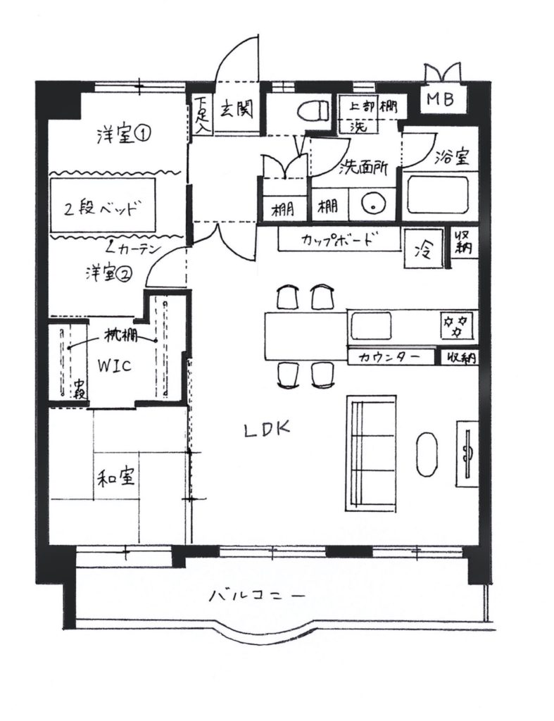 こちらが改装前の図面です。一般的な3LDKではありますが、写真の通りキッチン部分がどうしても「こじんまりとして、奥まった印象」を感じさせるお家でした。