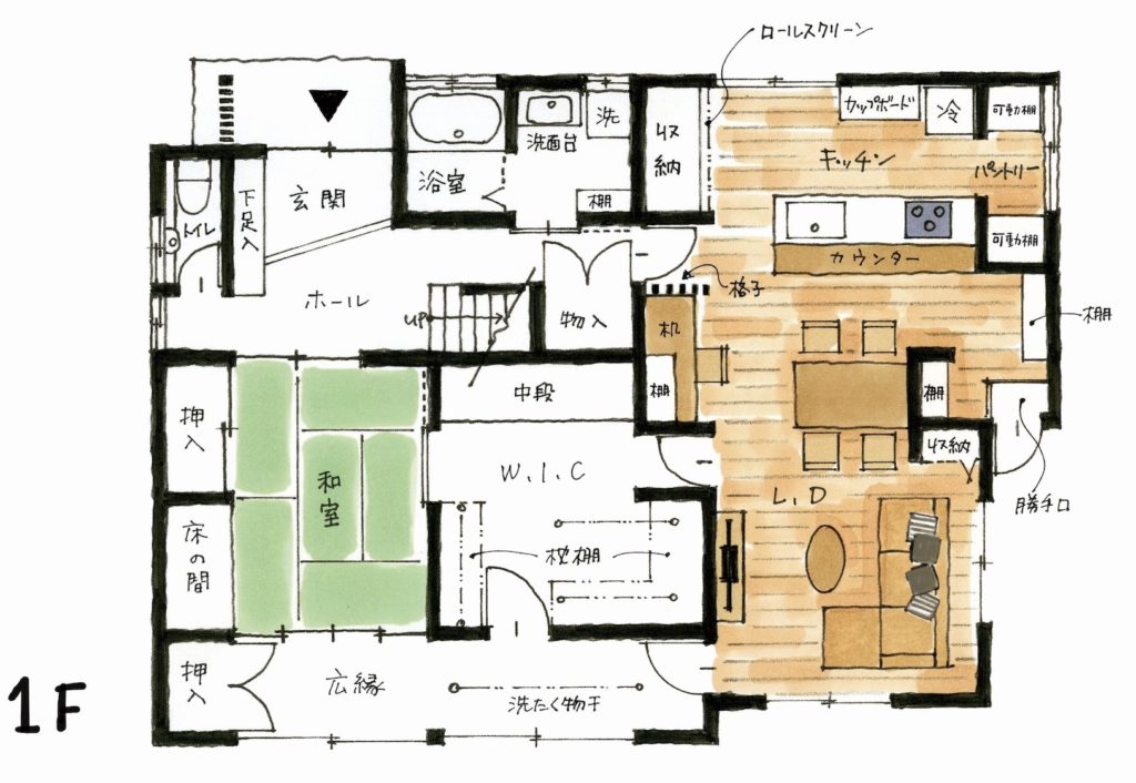そこで、はぴりの!ではお客さまのご要望を元に、家族みんなが「毎日を楽しく過ごせるリビング」を中心にして、大きな収納と来客時用の和室をバランス良く配置したプランをご提案させて頂きました(※実際の改装プランは、上記初期プランと一部で異なります)。