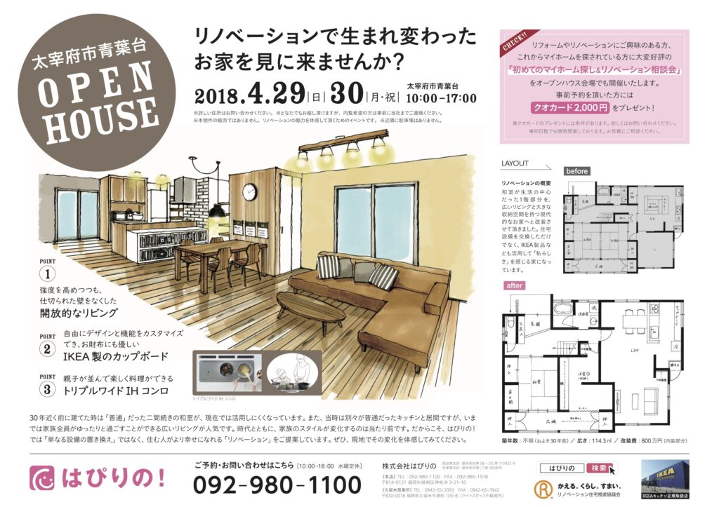 GW期間の前半、2日間限定でオープンハウスをさせて頂きます。今回は久しぶりの「戸建リノベーション」です。