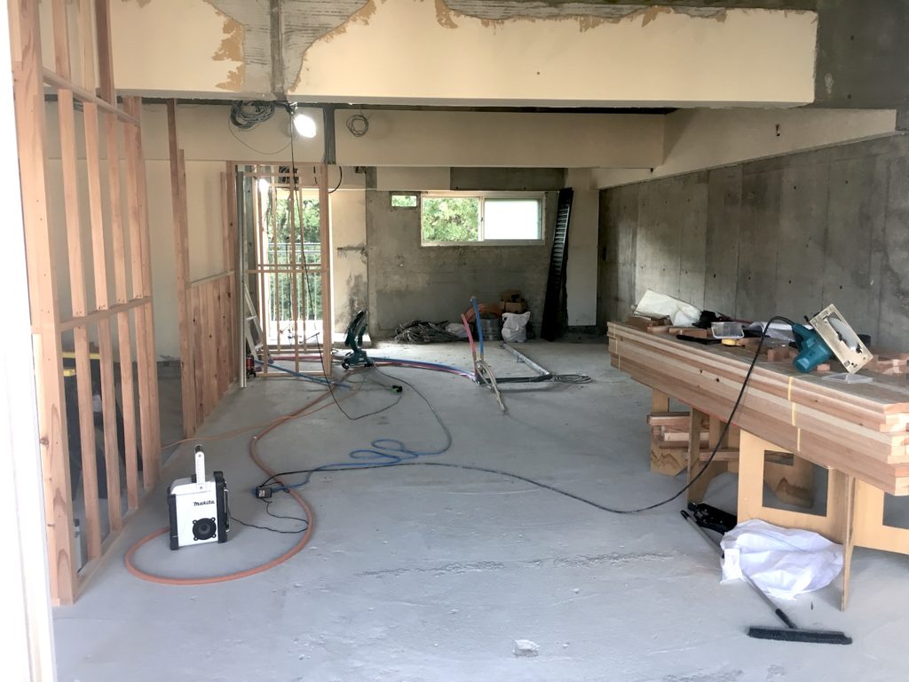 今年6月にブログでご紹介した「大濠ハイツ」のリノベーション工事(過去のブログはこちら)が、本格的に再開しました。