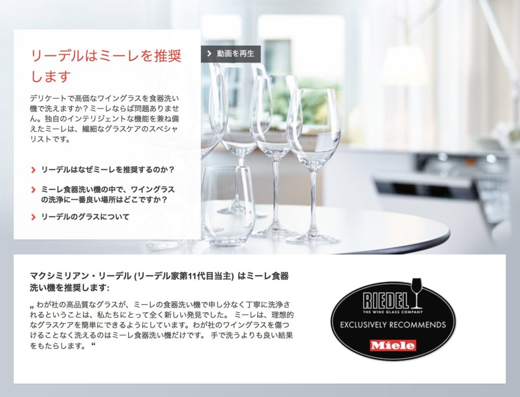 確かに、ミーレのホームページにはリーデル社のオススメコメントが掲載されていました。繊細な取り扱いが求められるワイングラスの洗浄に向いていることからも、品質の高さが伺い知れます。