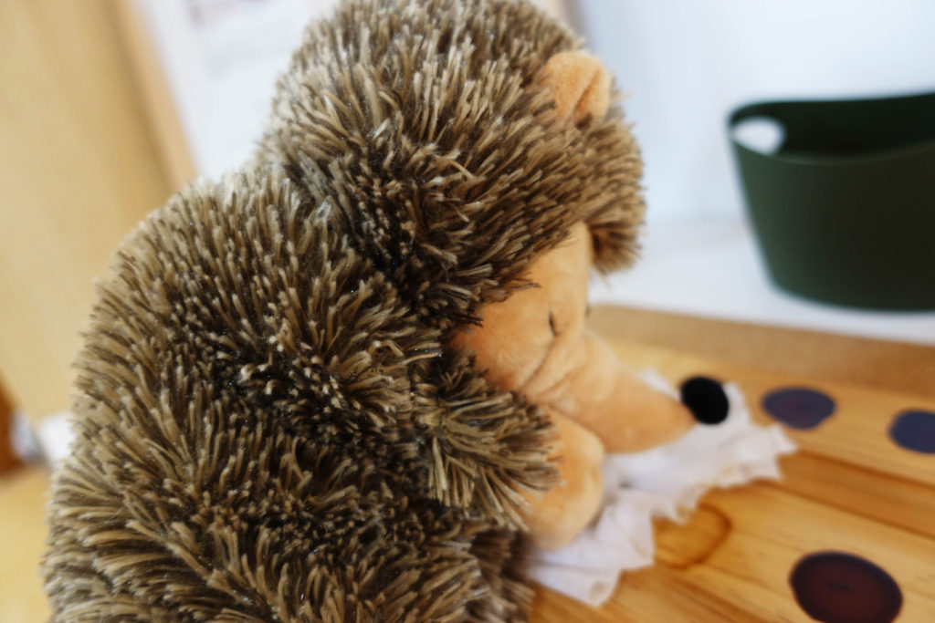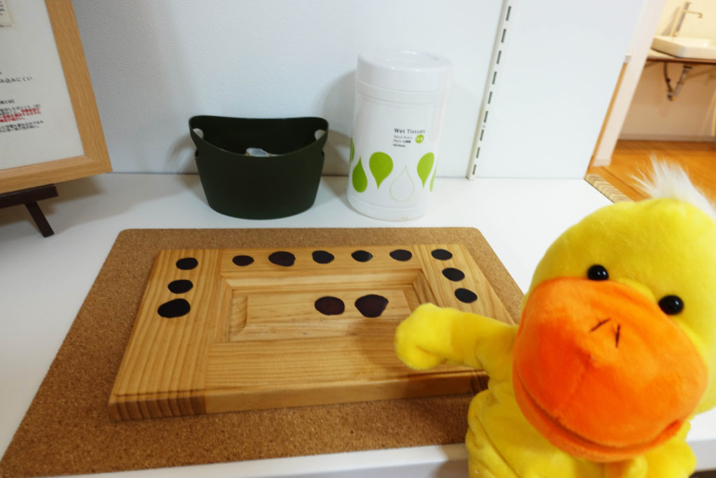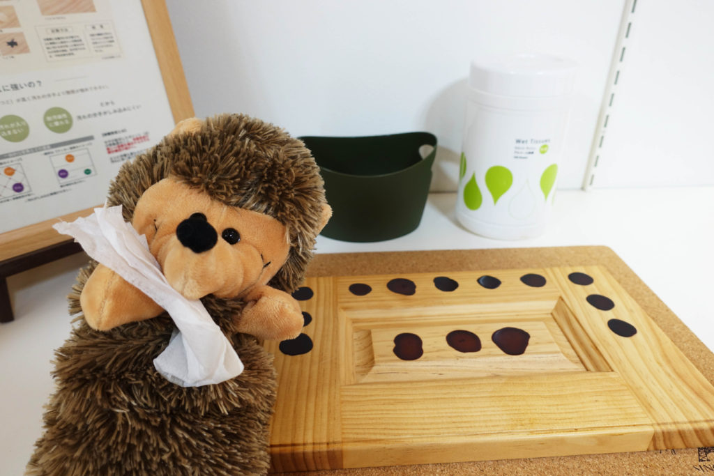 ハリー : 確かにオシャレと使いやすさのバランスって、大事ですよね。でも、ウッドワンの無垢材は独自加工がされていて、水や汚れにとっても強いんです。ここで、ちょっと実験してみましょう!こちらの無垢材には、半年前にこぼしたコーヒーをそのままにしてあります。これをウエットティッシュで拭いてみますね。