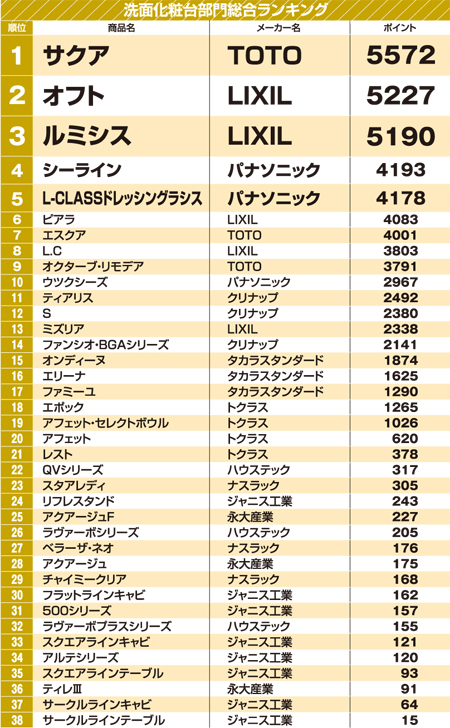 価格帯によって「高価格帯」「中価格帯」「普及価格帯」と3つのグレードに分けられていて、キッチン、ユニットバス、トイレ、洗面台、そしてコンロの5つの部門で投票が行われます。